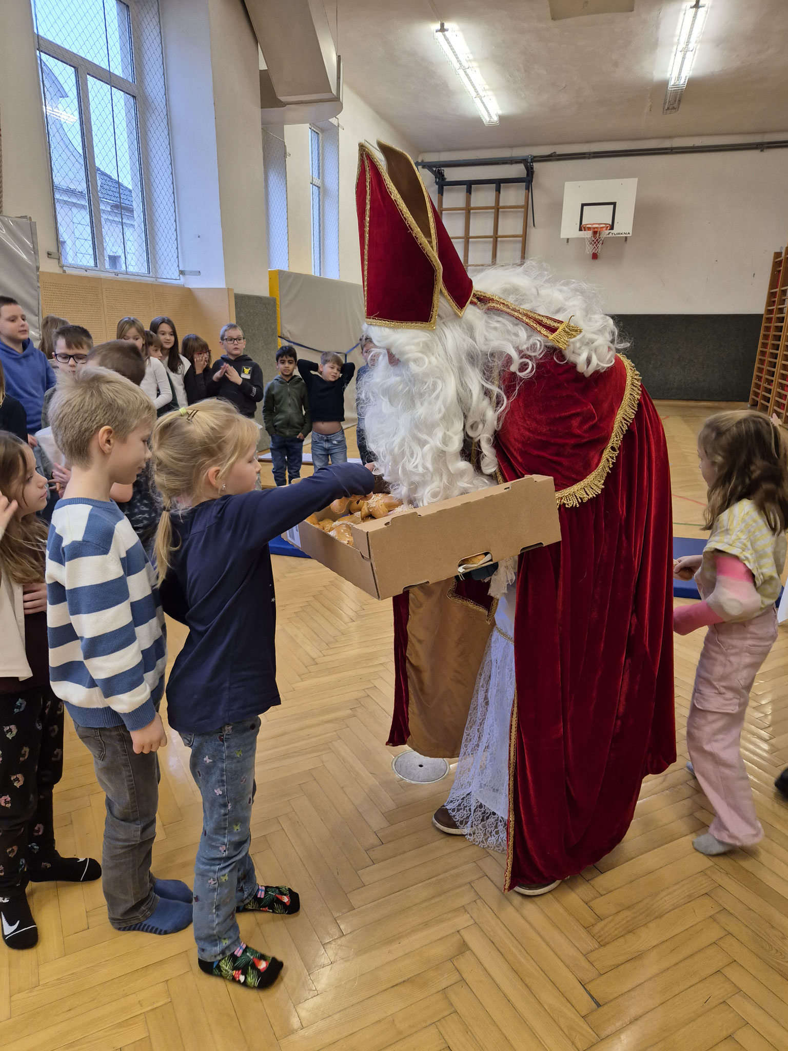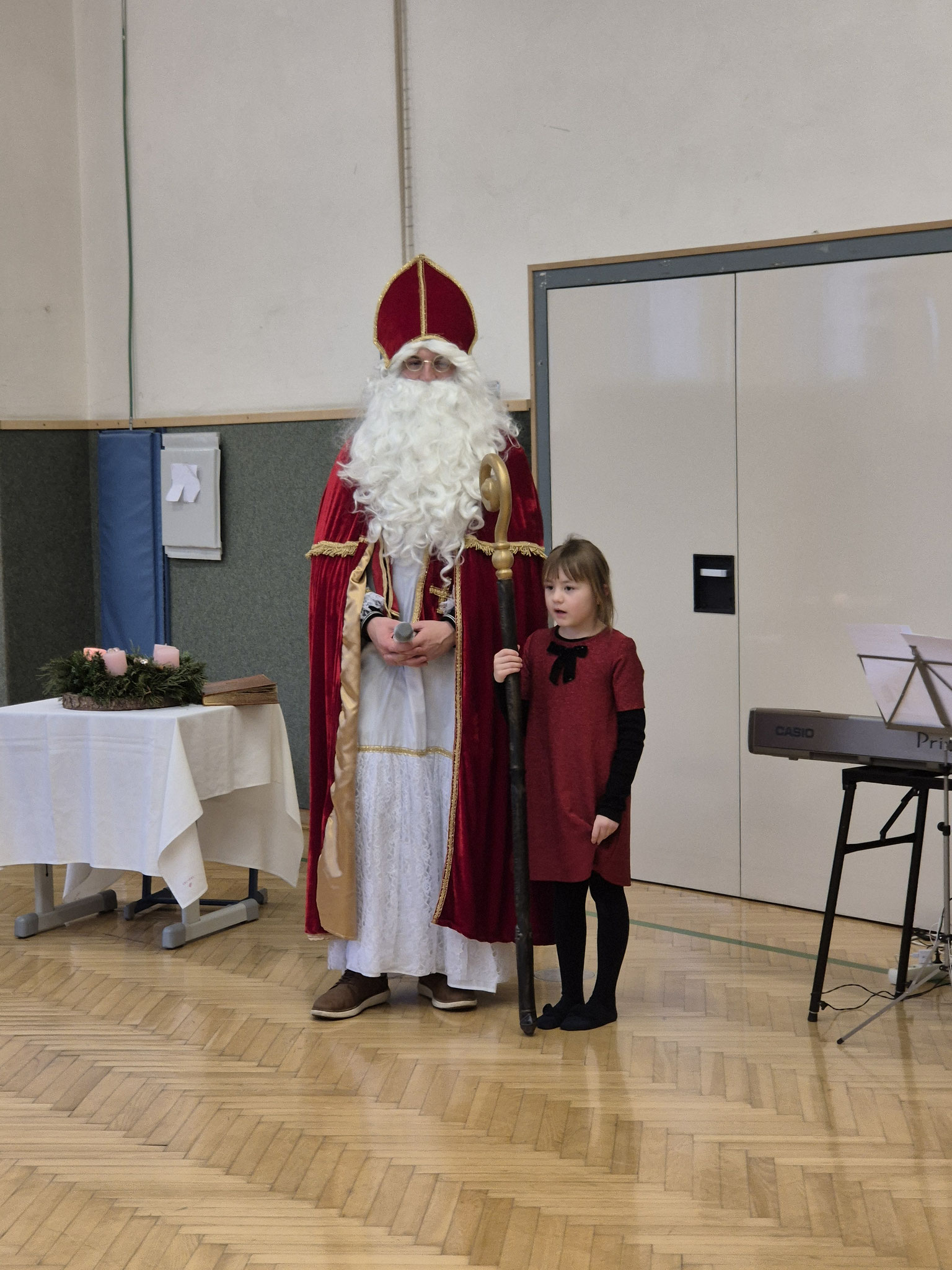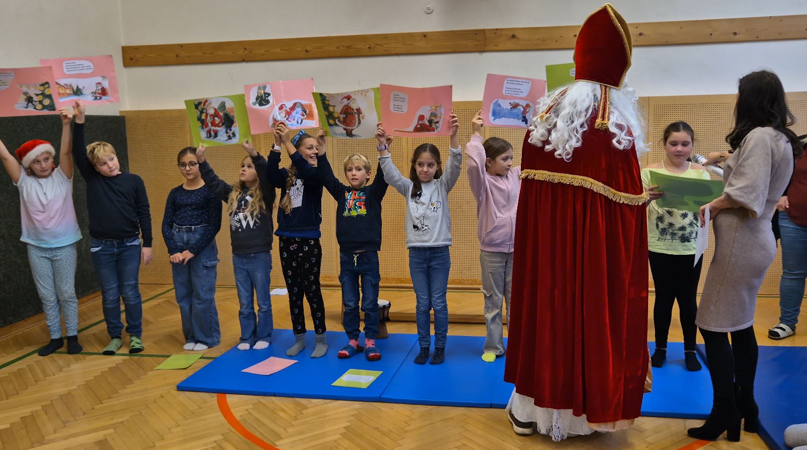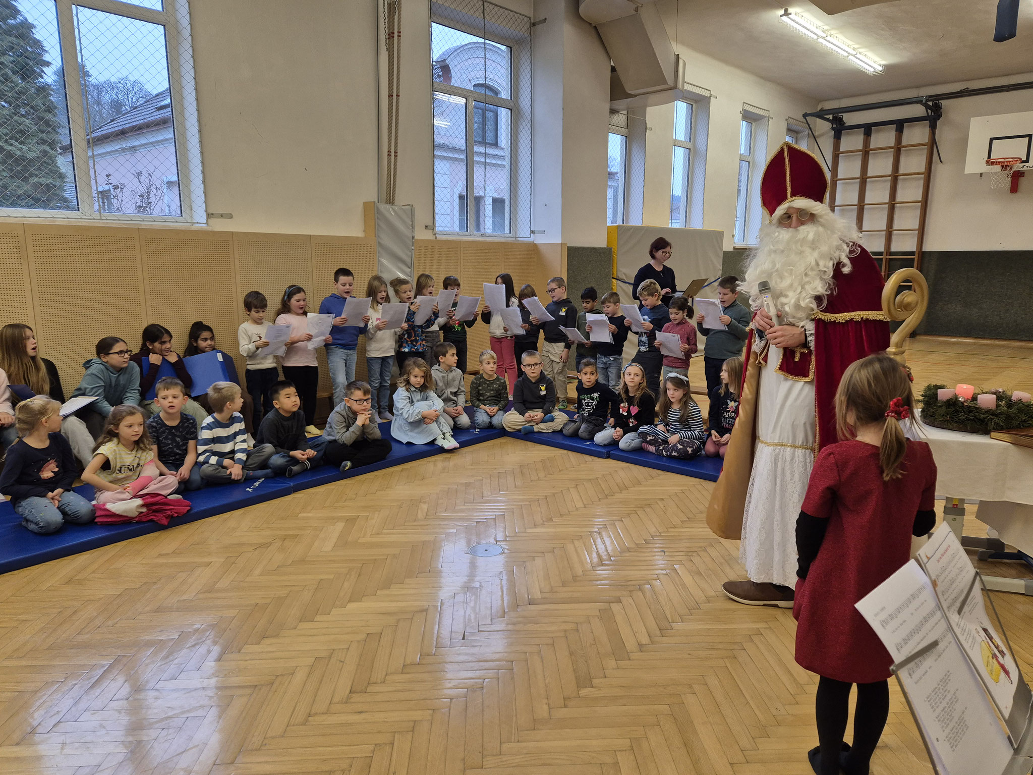 Alle Kinder versammelten sich aufgeregt im Turnsaal, wo eine kleine Nikolausfeier mit gemeinsam gesungenen Liedern und einem vorgetragenen Gedicht abgehalten wurde. Der Nikolaus in seinem prächtigen Gewand verzauberte nicht nur die Erstklässler.