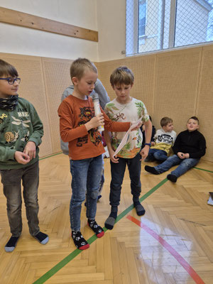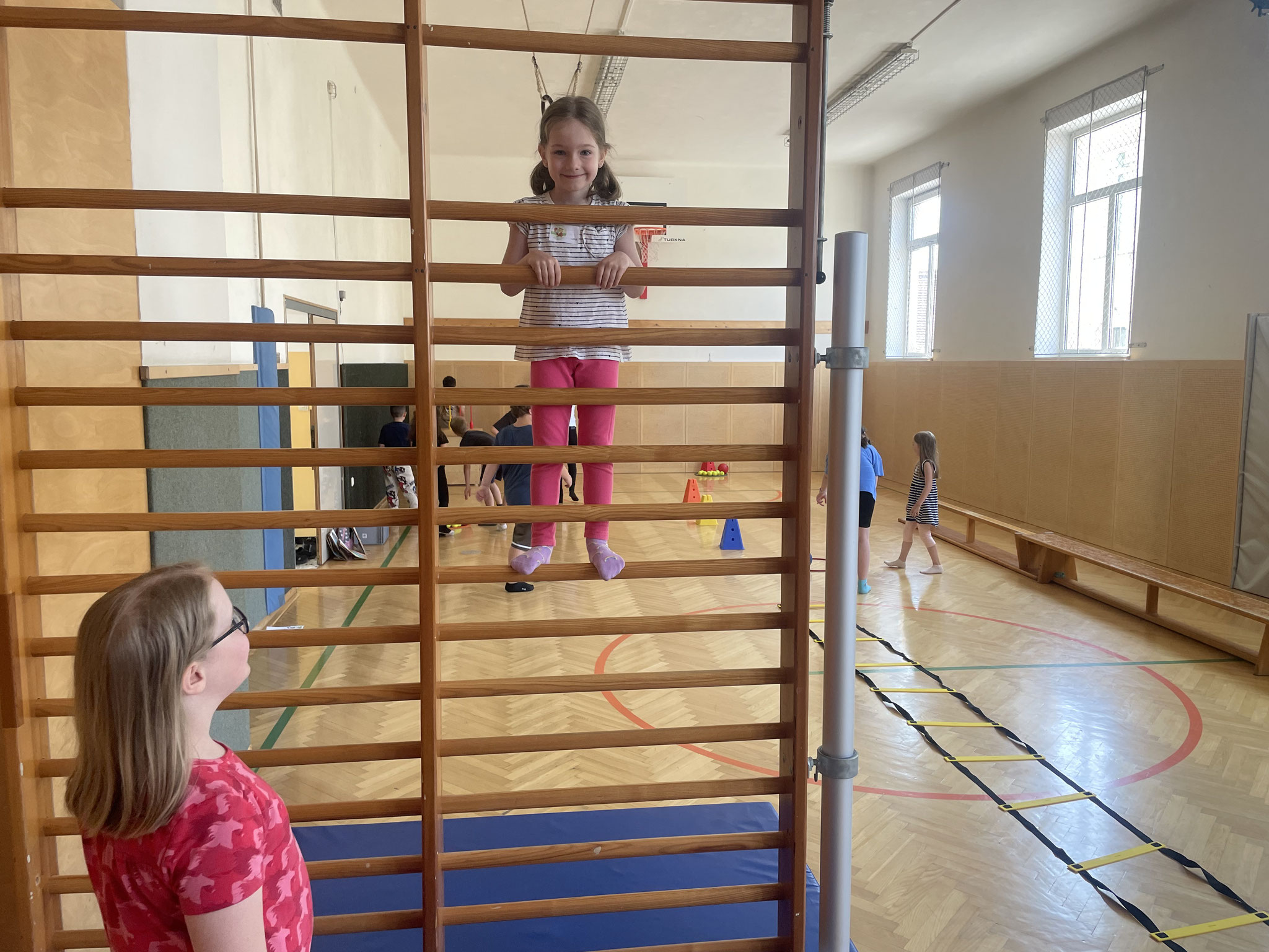 Im Turnsaal warteten Bewegungsstationen wie Klettern über die Sprossenwand, Springen auf den Weichboden, Balancieren über die Langbank und Abschießen von Kegeln auf die Kinder. Genaues Zuhören