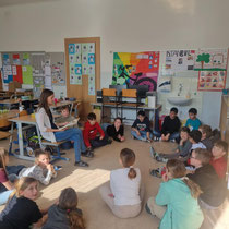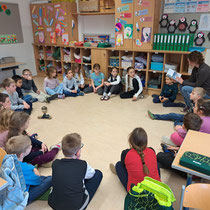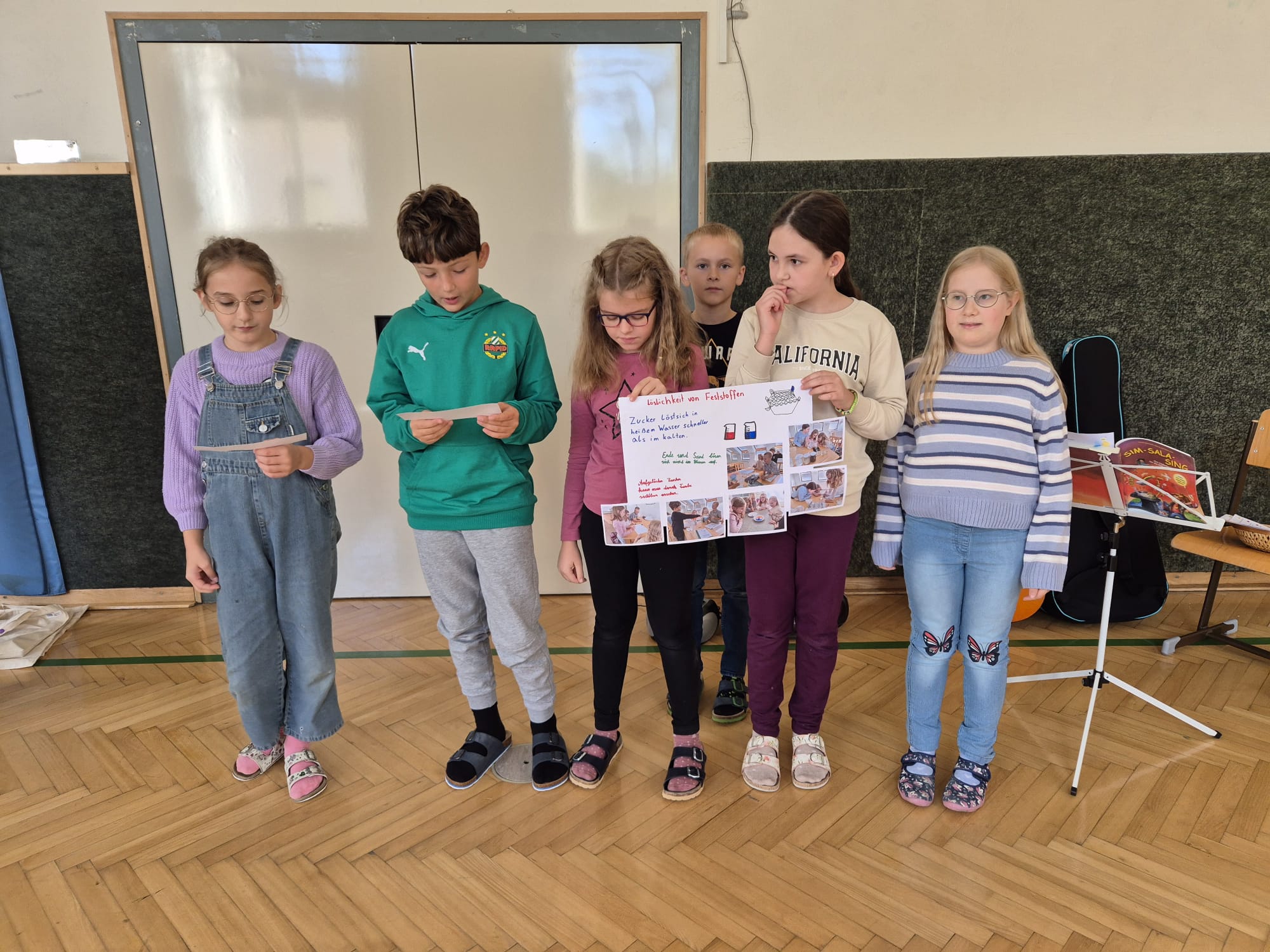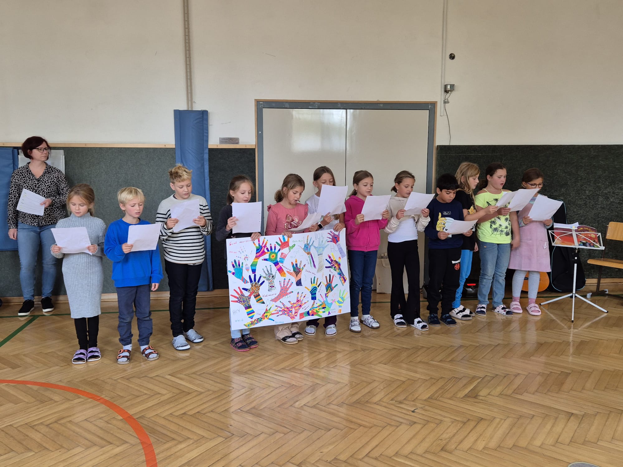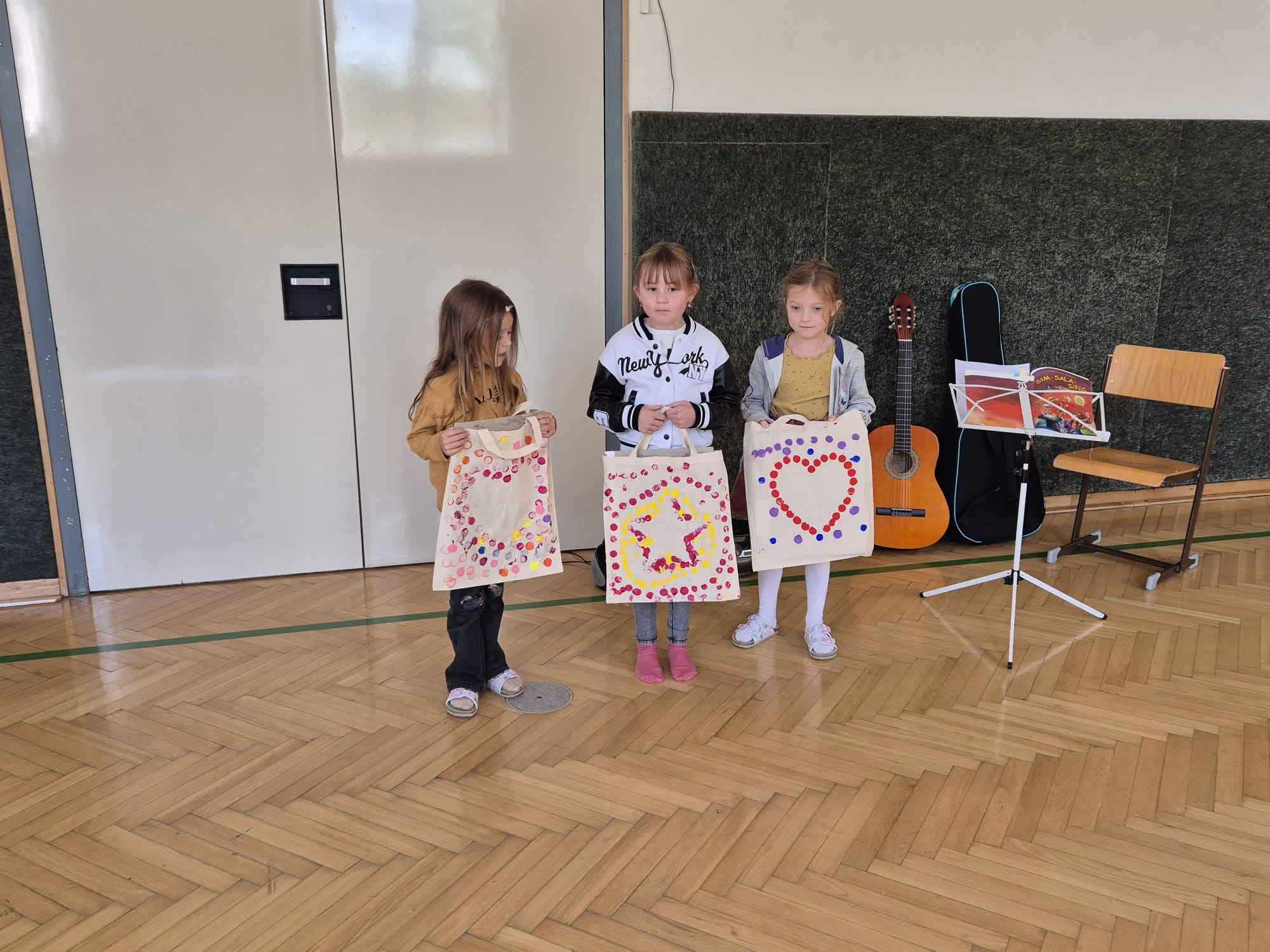 Dieses Mal stellte die 1. Klasse ihre selbst bedruckten Taschen vor. Die 2. Klasse führte mit der Moderation durch das Programm und gab uns einen Einblick in das Wetter. Ein internationales Begrüßungslied wurde von der 3. Klasse gelernt und gemeinsam mit einem passenden Plakat präsentiert. Die Kinder der 4. Klasse stellten den Klimaworkshop und selbstgenähte Katzen-Türstopper vor. Zum Schluss erzählten Kinder der "Forscherwelt", woran sie in der letzten Einheit geforscht haben.