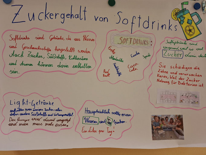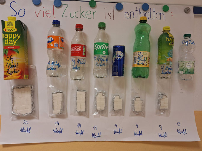 die enthaltenen Zuckermengen mit Zuckerwürfeln abgewogen. Ihre Ergebnisse haben sie anschaulich auf einem Plakat dargestellt, welches sie in der nächsten Schulversammlung präsentieren werden. So