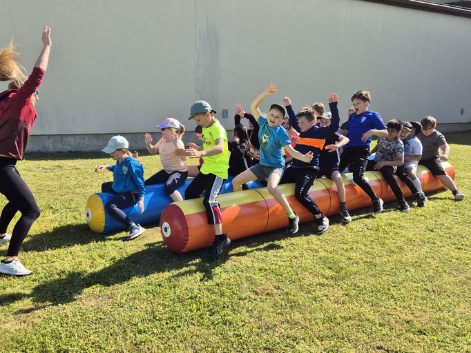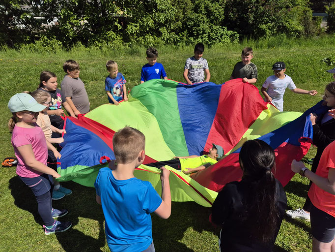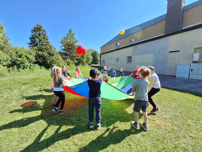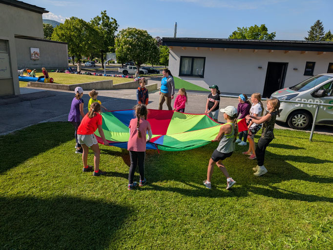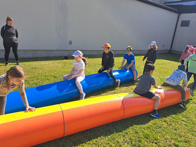 In zwei weiteren Stationen wurden lustige Übungen und Spiele mit dem Fallschirm und an aufblasbaren Rollen ausprobiert.