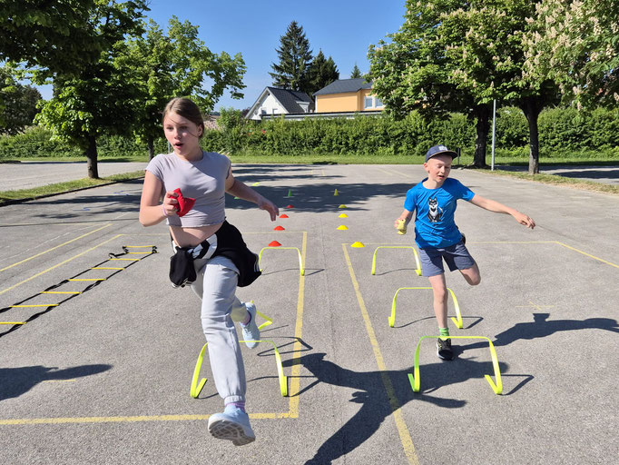 Im Anschluss daran durchliefen die Kinder vier Stationen, die für Abwechslung und viel Spaß sorgten. In zwei verschiedenen Parcours konnten sie ihre motorischen Fertigkeiten, ihre