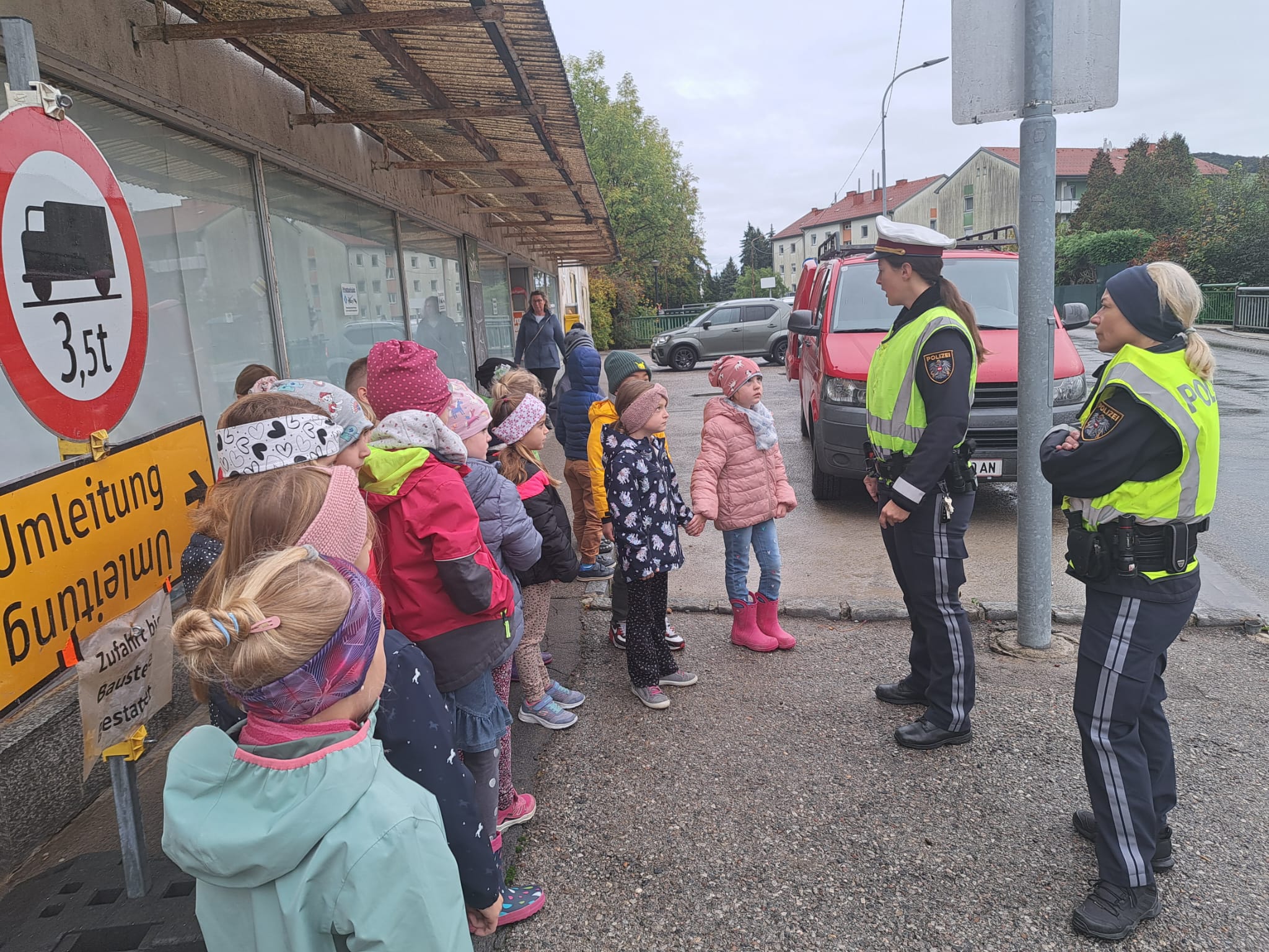 Die Polizistinnen erklärten den Kindern die wichtigsten Verkehrsregeln, um Gefahren auf dem Schulweg zu vermeiden. Anschließend durften die Kinder das Gelernte praktisch umsetzen und unter Anleitung das Überqueren des Zebrastreifens üben. Besonderes Augenmerk lag dabei auf dem richtigen Verhalten: Stehen bleiben, Blickkontakt mit den Autofahrern suchen und erst dann sicher die Straße überqueren.