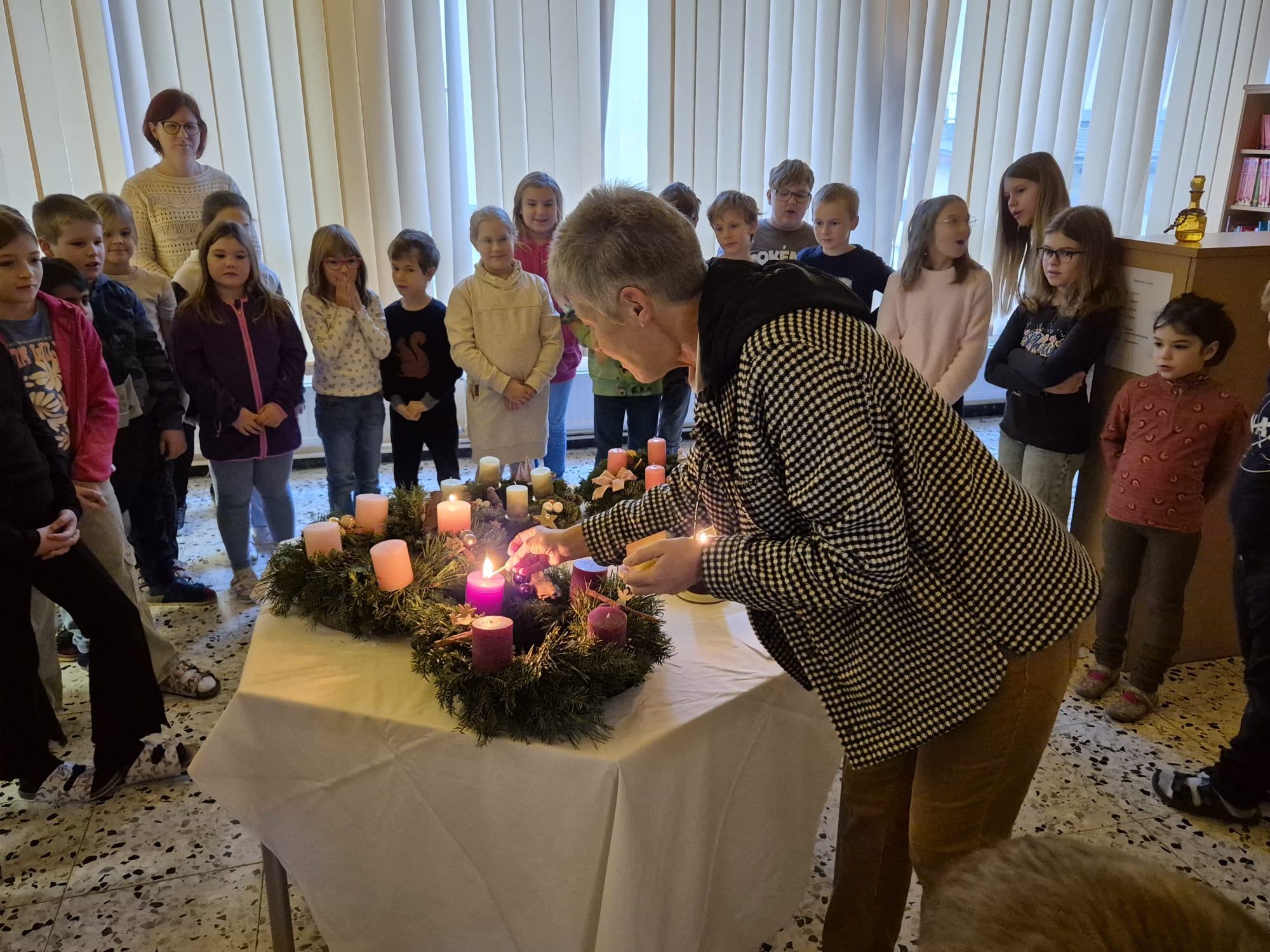 Am Montag, dem 2. Dezember fand die alljährliche Segnung der klassenweise mitgebrachten Adventkränze durch unsere Religionslehrerin Frau Daniela Weihs statt.