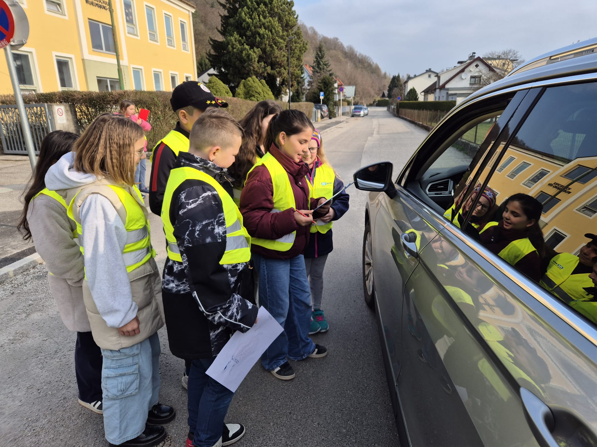 Mit einem eigenen Messgerät überprüften die Kinder in der nahegelegenen 30er-Zone die Geschwindigkeit der vorbeifahrenden Autos. Wurde ein Fahrzeug angehalten, durften die Kinder die Fahrerinnen und Fahrer selbst befragen – zum Beispiel nach ihrer Geschwindigkeit und den Gründen für ihr Fahrverhalten.