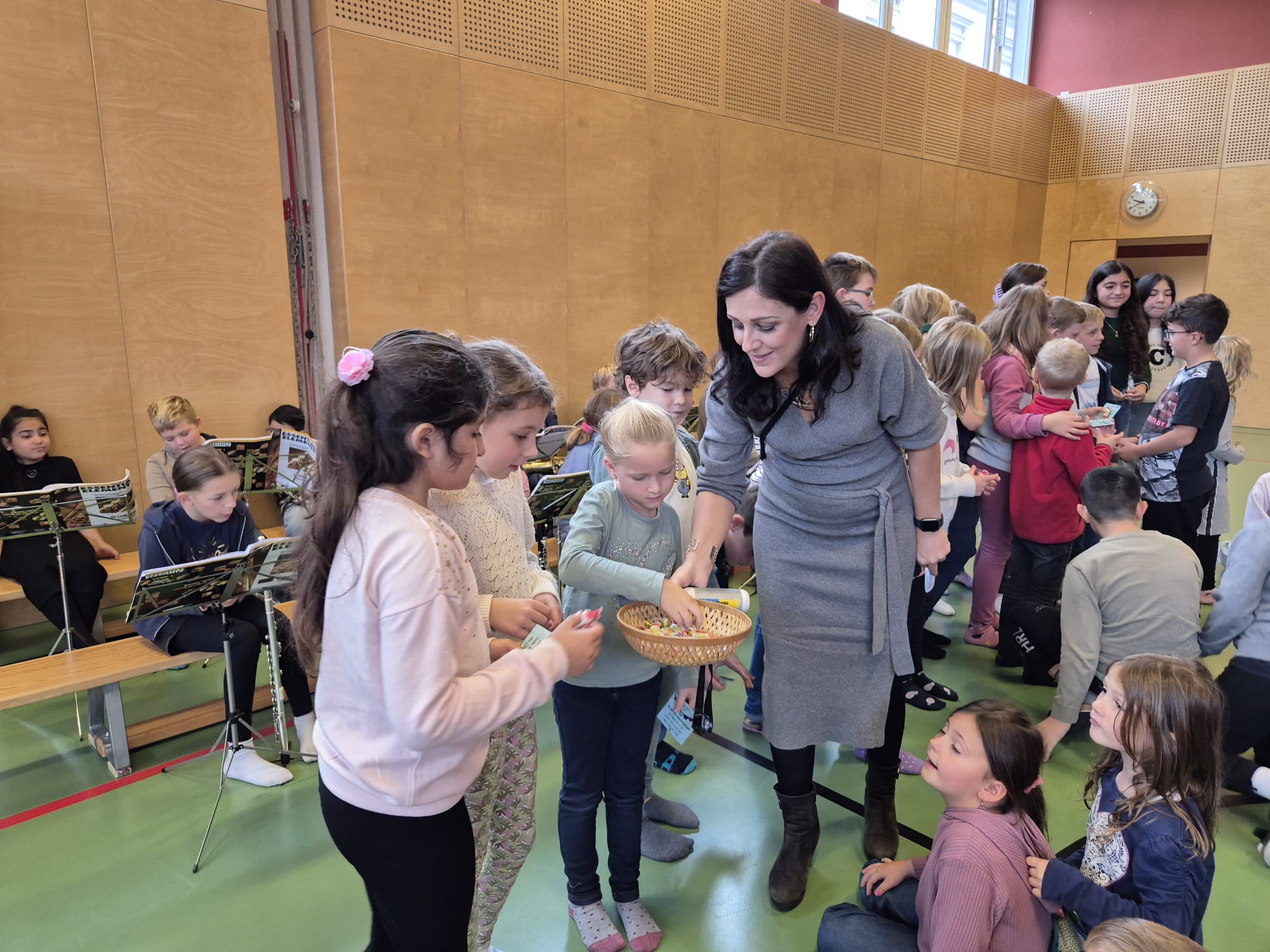 Seit nunmehr 20 Jahren gibt es an unserer Schule eine Bläserklasse, die im Zuge einer unverbindlichen Übung angeboten wird. Unter der Leitung von Franz Griesler von der Musikschule treffen sich die Schülerinnen und Schüler der 2. – 4. Klasse, um ihrer gemeinsamen Leidenschaft, dem Musizieren, nachzugehen. In unserem Schulorchester sind Holz- und Blechblasinstrumente genauso vertreten wie ein Streichinstrument. Einen spannenden Höhepunkt der bisherigen Probentätigkeit stellte jenes Ständchen dar, das unserer Frau Direktor anlässlich ihres 50. Geburtstags dargeboten wurde. Weitere Auftritte sind bereits in Planung.